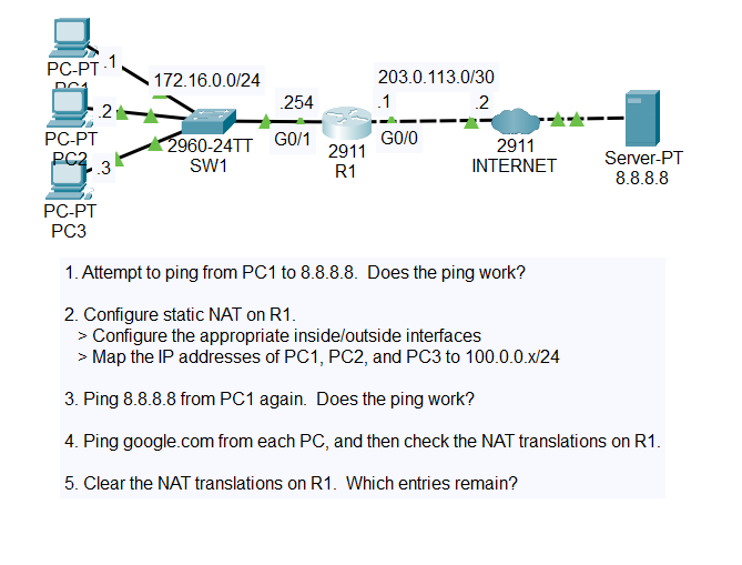 R1(config)#ip nat inside source static 172.16.0.3 100.0.0.3